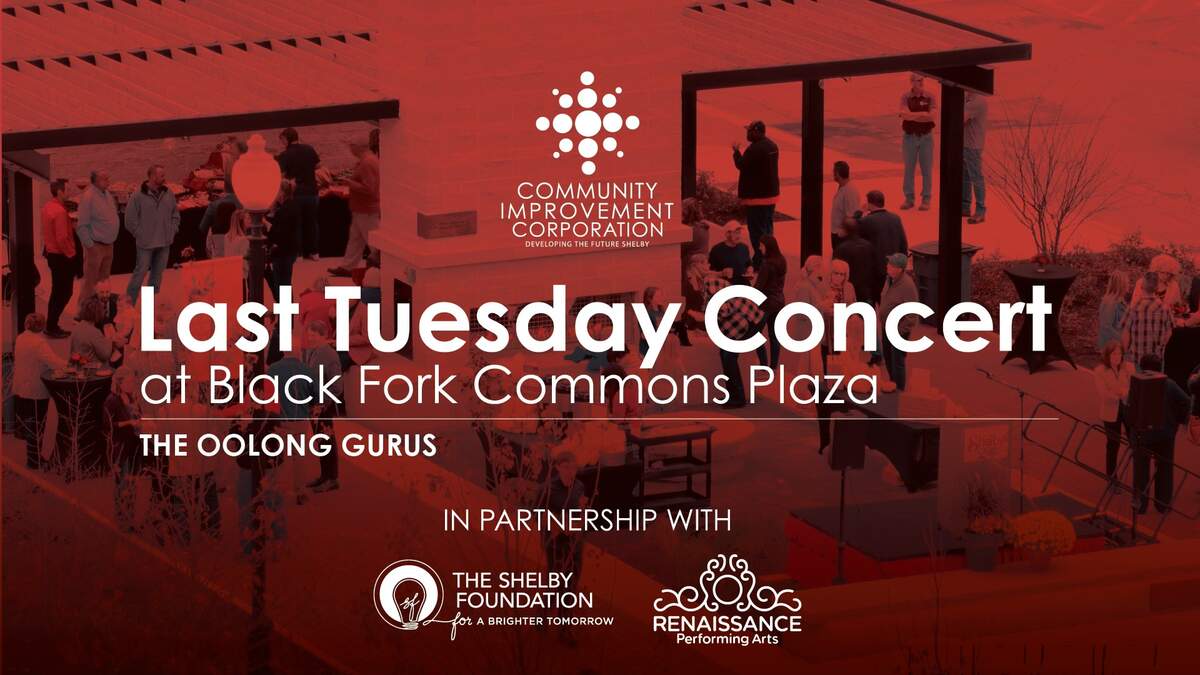 Join us at Black Fork Commons for May's 'Last Tuesday' concert, featuring The Oolong Gurus! The set starts at 6 PM. Proudly presented by CIC of Shelby in partnership with The Shelby Foundation and the Renaissance Theatre
