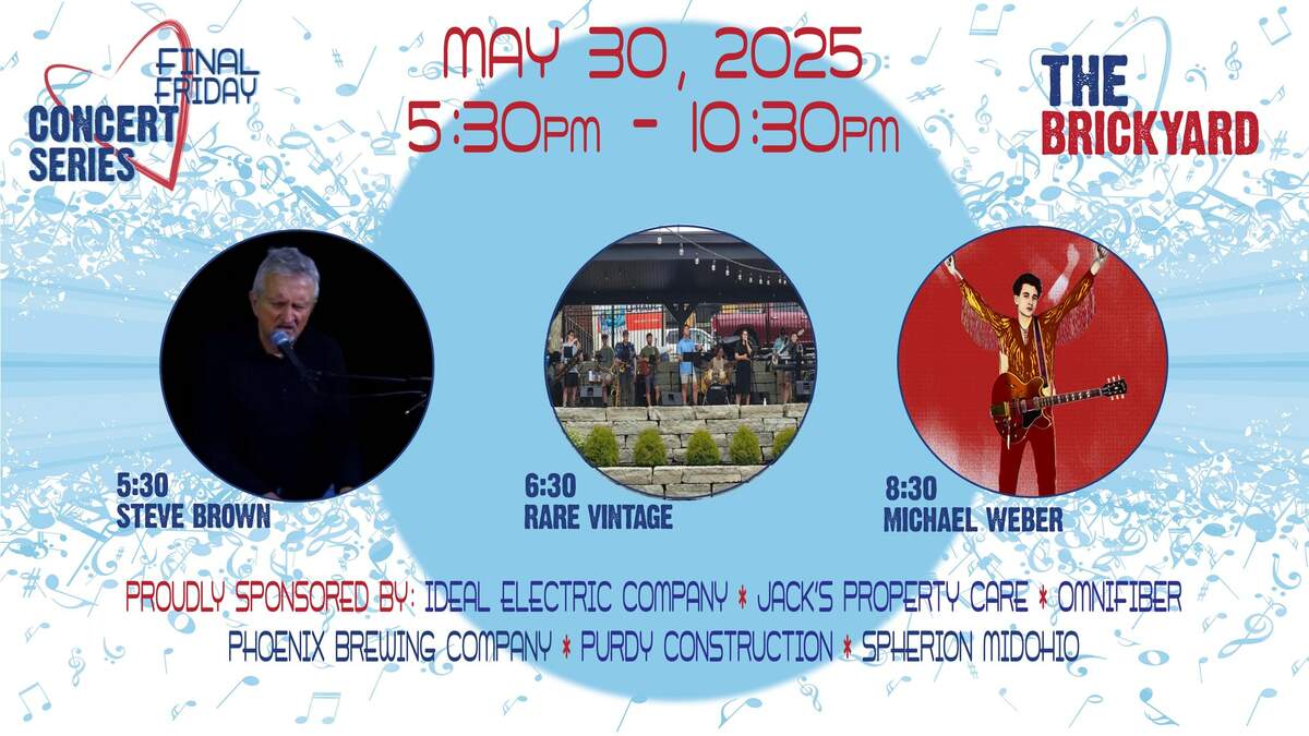 Final Friday Concerts are free and open to the public, lawn chairs are encouraged and refreshments are available for purchase. Music begins at 5:30pm, features three acts and ends at approximately 10:30pm. Outside beverages and coolers are prohibited. Entertainment will be announced soon!